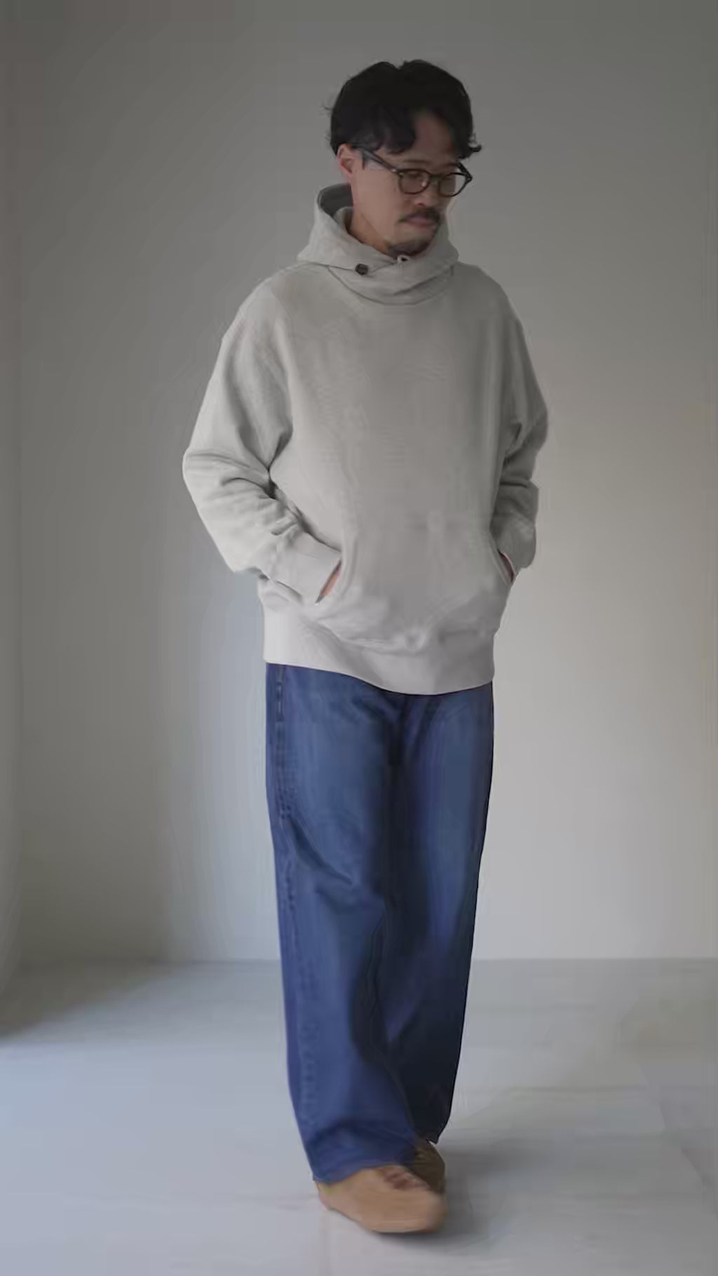 肩を落としたドロップショルダーで動きやすさを与え、やや広めの身幅に設定することで着心地はリラクシーに。丈もコンパクトにすることで、ボリュームのあるフードとのバランスを整えたシルエットを形成しています。