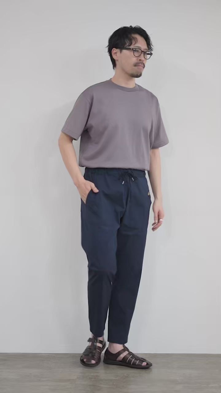 裾は足首丁度くらい。腿周りはゆとりがあり、ウエストはやや大きい印象でした。ウエストは紐で調節ができるので、問題なく着用できます。軽くてリラクシーな着用感が好印象でした。