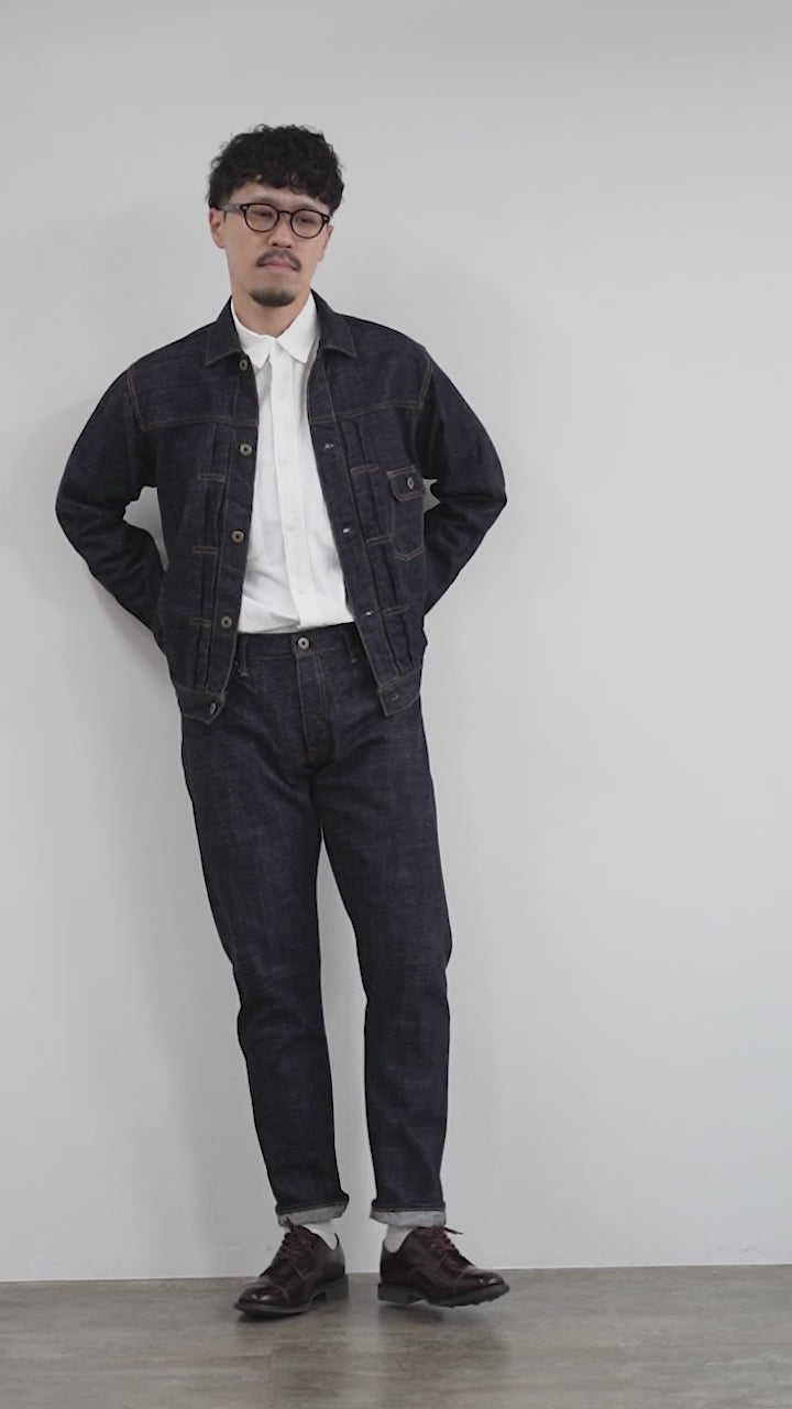 ヒップとワタリにゆとりを持たせつつ、膝下から裾にかけてスッと細く落ちるテーパードラインが、モンスターデニムの存在感をスマートに引き立ててくれる一本です。