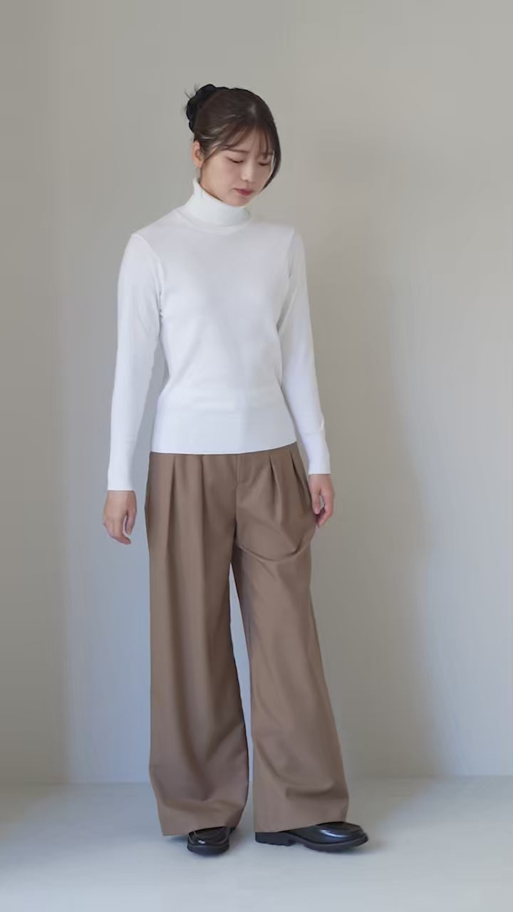 程よくゆとりを持たせつつ、もたつかない上品なシルエットが魅力。首元は締め付けのないタートル仕様で、「チクチクが苦手」「暖房の効いた室内ではウールが暑い」という方にも快適です。