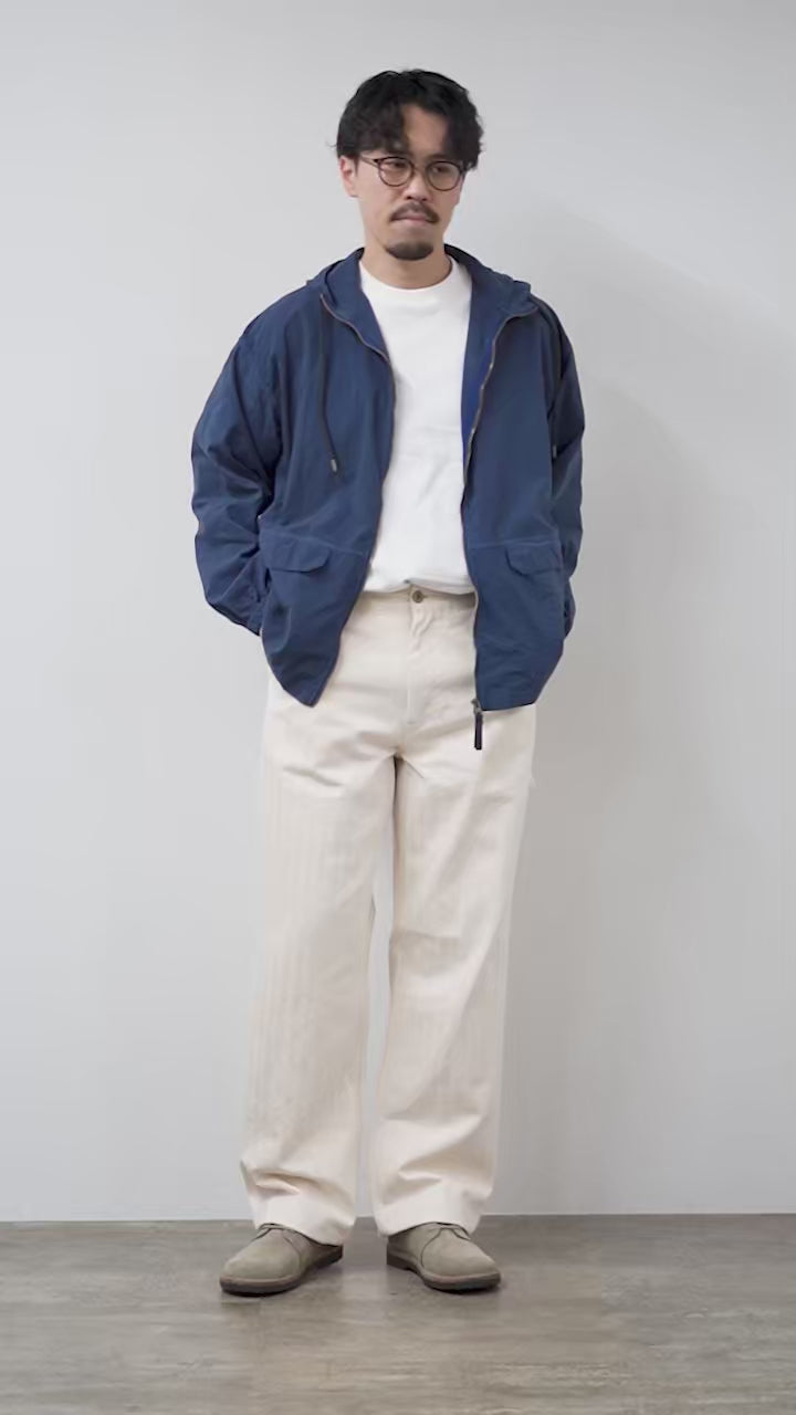 FOBが生地メーカーと共同開発した、オリジナルのヘリンボーン生地を使用したペインターパンツ。