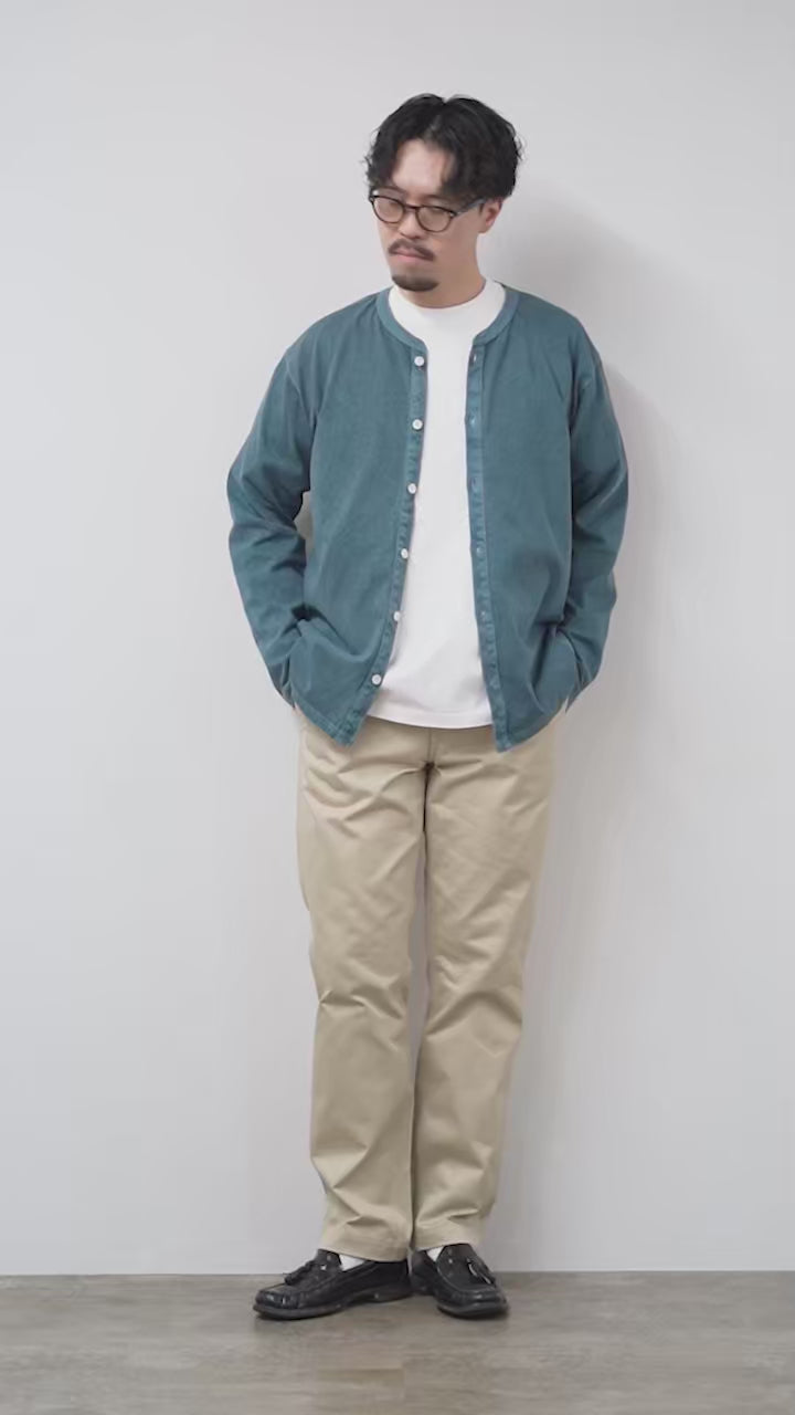 また、こちらは他にはない味のある表情が特徴のピグメントダイ(顔料染め)で仕上げています。洗濯の度に表面から徐々に色褪せし、さらに風合いを増していくので、ヴィンテージ品のような佇まいに変化していきます。