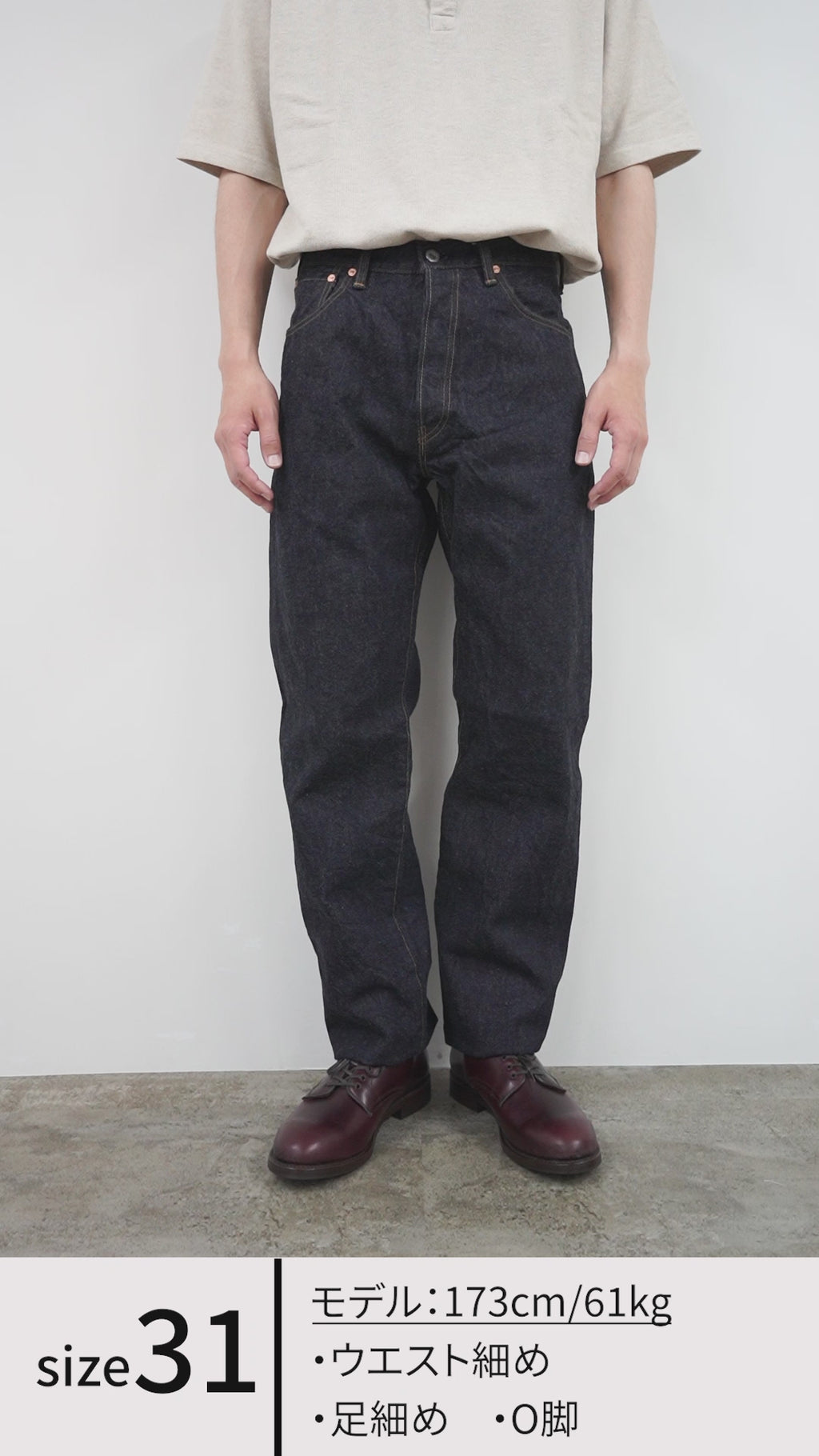 ウエストに余裕がある分、腰で落として穿くとデニムらしいラフさが出ます。裾に向かって自然に細くなるので、ロールアップしても収まりが良い印象です。
