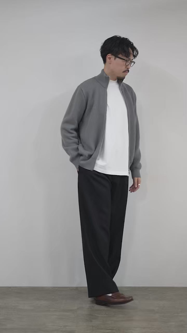 表面の滑らかさのおかげで、上からコートを重ねてももたつかず、冬のレイヤードにも最適です。ニットの柔らかさとブルゾンの構築感を両立した、まさに“都会派ドライバーズニット”です。