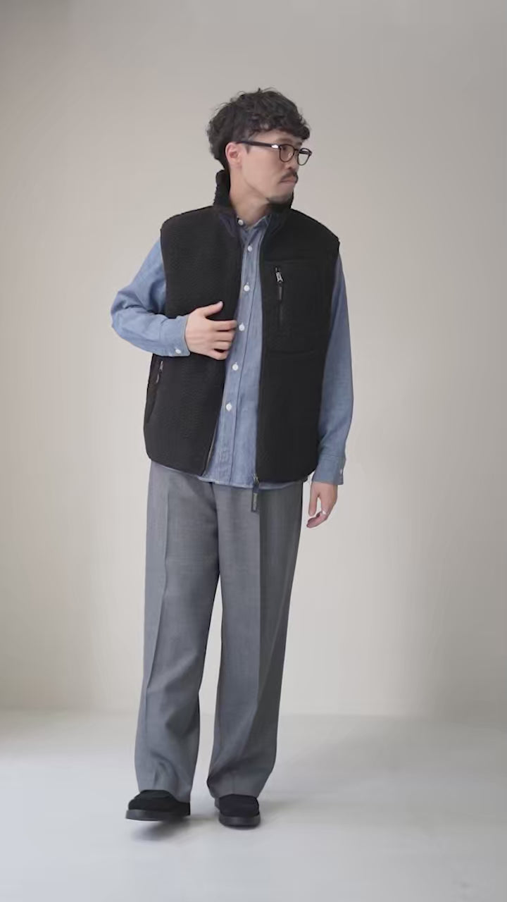 裏地は毛足のないフラットな肌触りなので、インナーと干渉しづらくスムーズに着用していただけます。