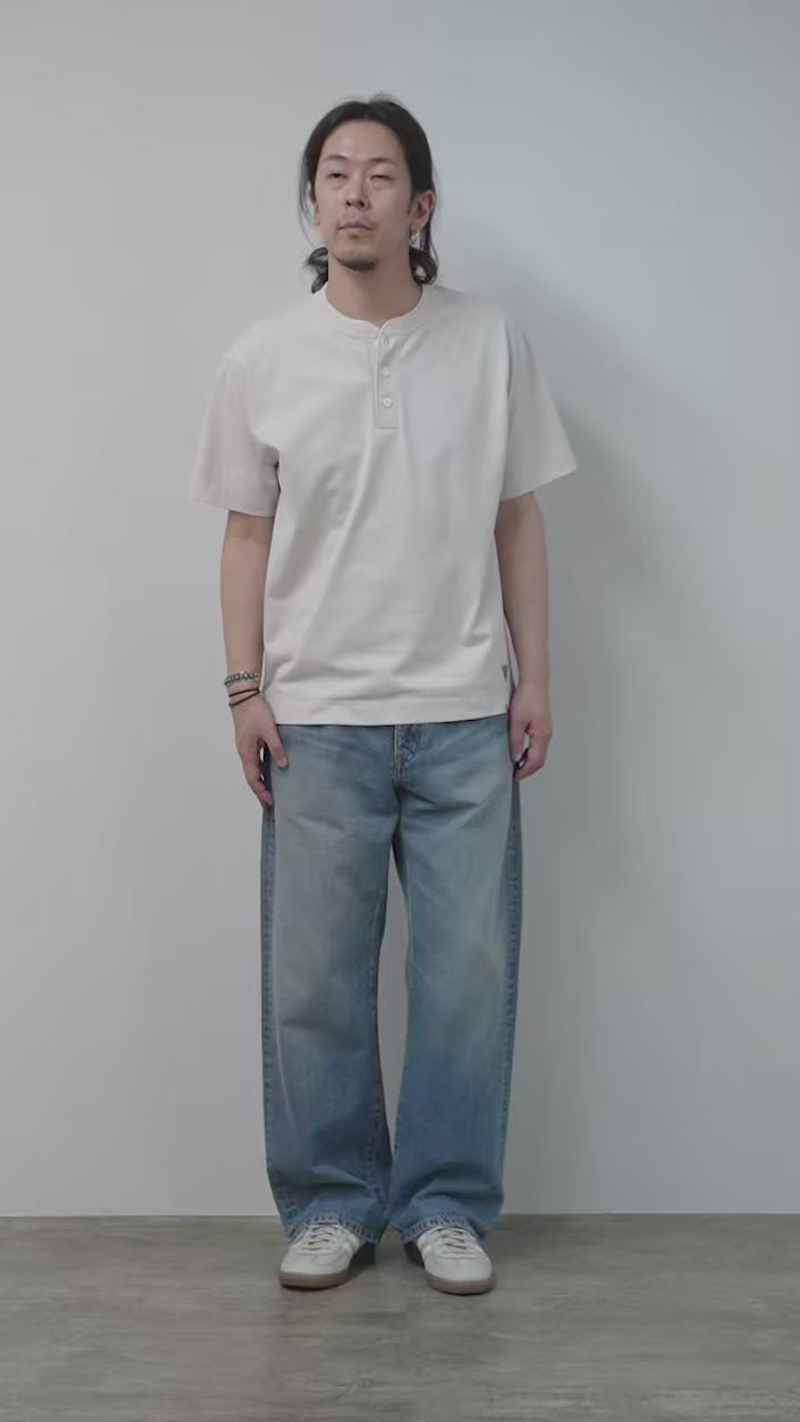ネック部分は、伝統的な3つボタンのヘンリーネック。ボタンにはやや小ぶりのクラシカルな、ネコ目ボタンを採用しています。また、バインダー仕様にすることで衿元に厚みが生まれ、丈夫で伸びにくいタフな仕上がりです。