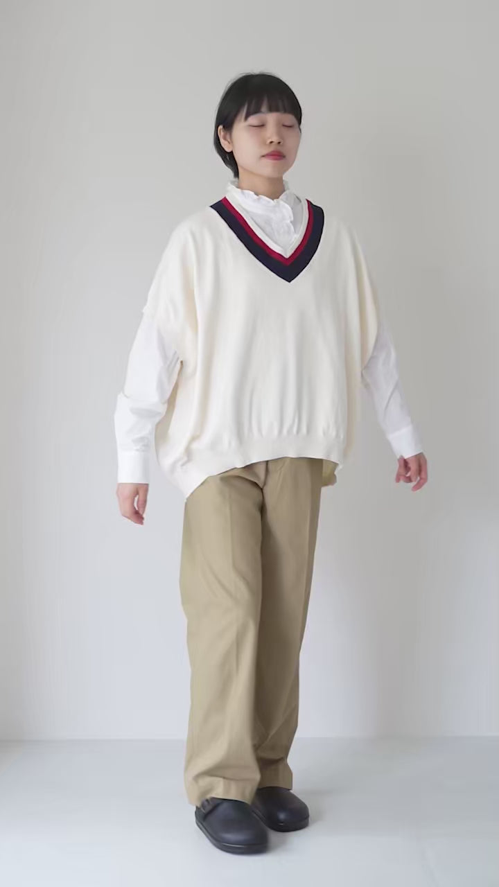 1枚でももちろん、ニットやスウェットを合わせて、首元のフリルをさりげなく見せるレイヤードスタイルにも。フリルに心を弾ませる大人女子にぴったりの上品なアイテムです。
