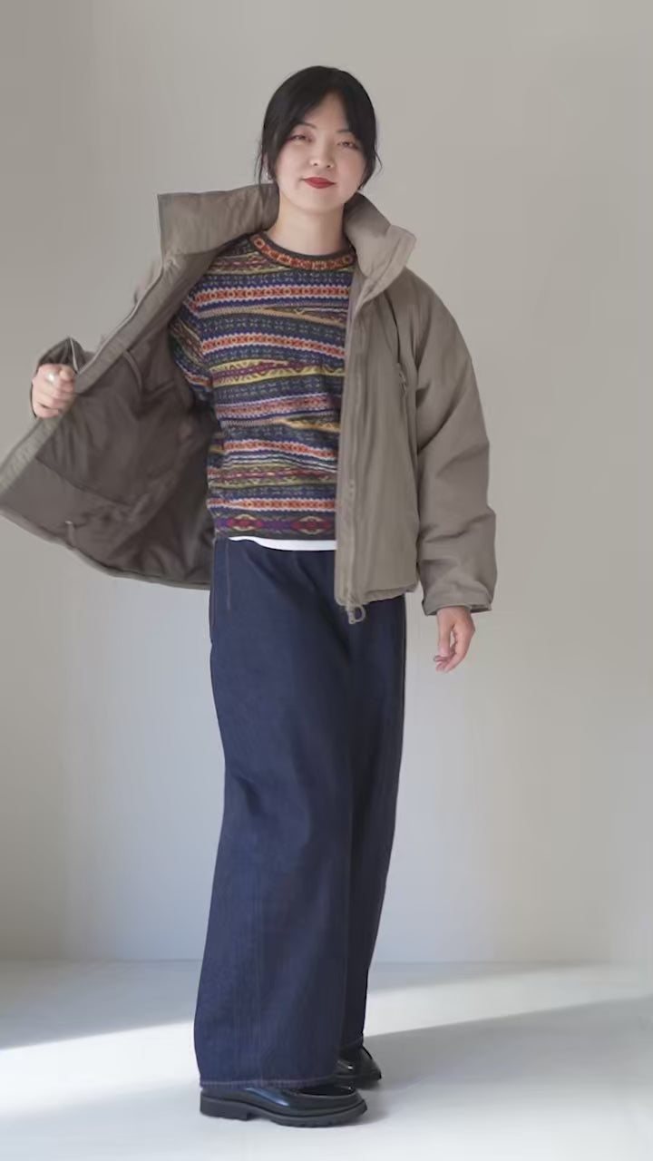 着丈はヒップの真ん中より少し上あたりの位置で、ややショートめのバランス。腰まわりがすっきり見える丈感です。袖丈は手の甲に軽くかかる長さで、冷たい空気をしっかり防いでくれる印象。身幅は広めで、中に厚手のトップスを着ても余裕のある着心地でした。