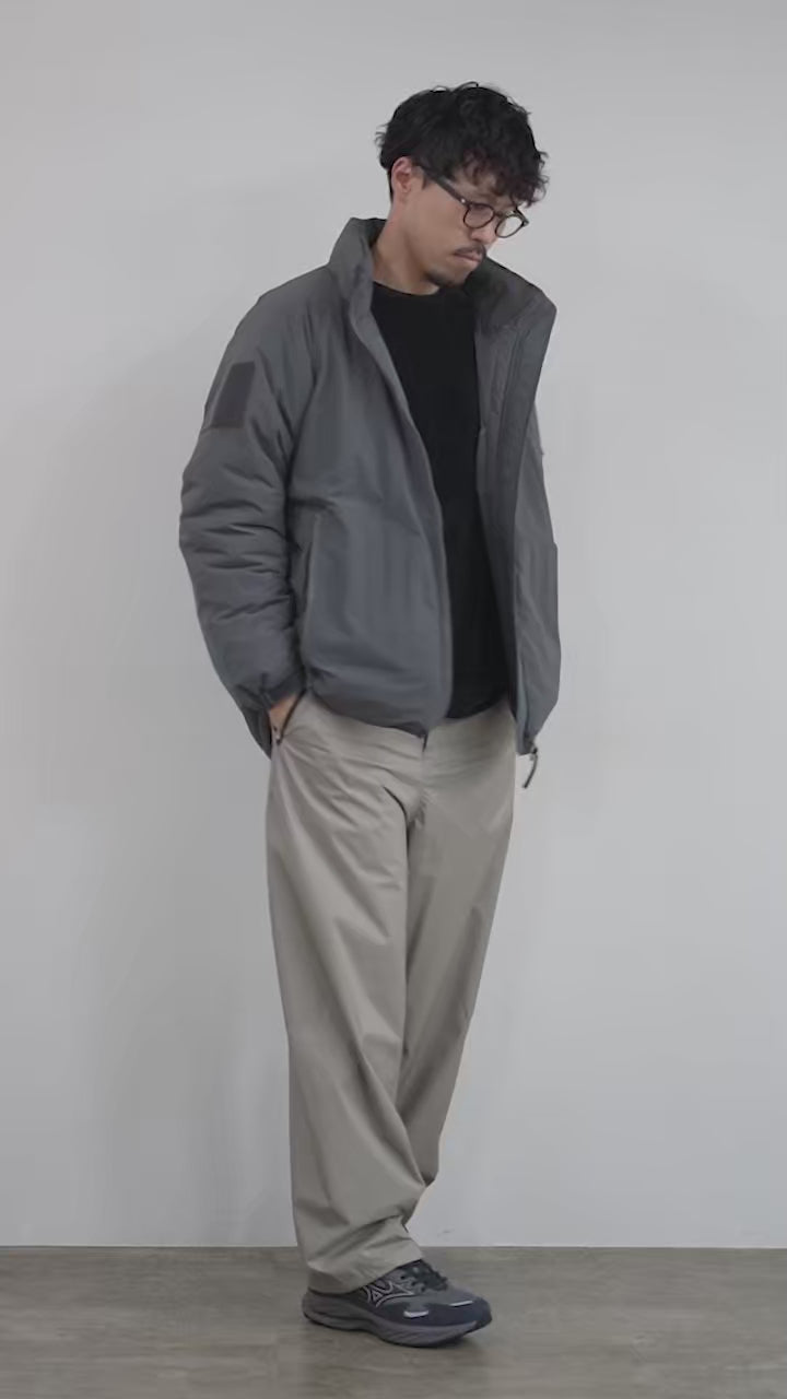 着用モデル写真と同じようなシルエットで着ることが出来ました。ナイロン素材にありがちな光沢が抑えられているため、落ち着いた雰囲気で着こなせるのが好印象です。