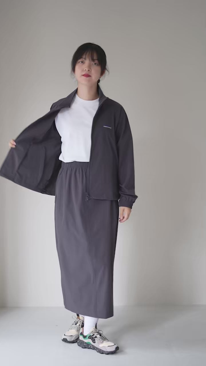 トップスとアウターはヒップの3分の1が隠れる着丈で、身幅がゆったりしているので快適な着心地でした。裾にドローコードが付いているので小柄な方もバランスがとりやすいと思います◎。生地感も軽いのでシルエットの調節がしやすかったです。スカートの着丈は長すぎず、足首が隠れるくらいの長さです。