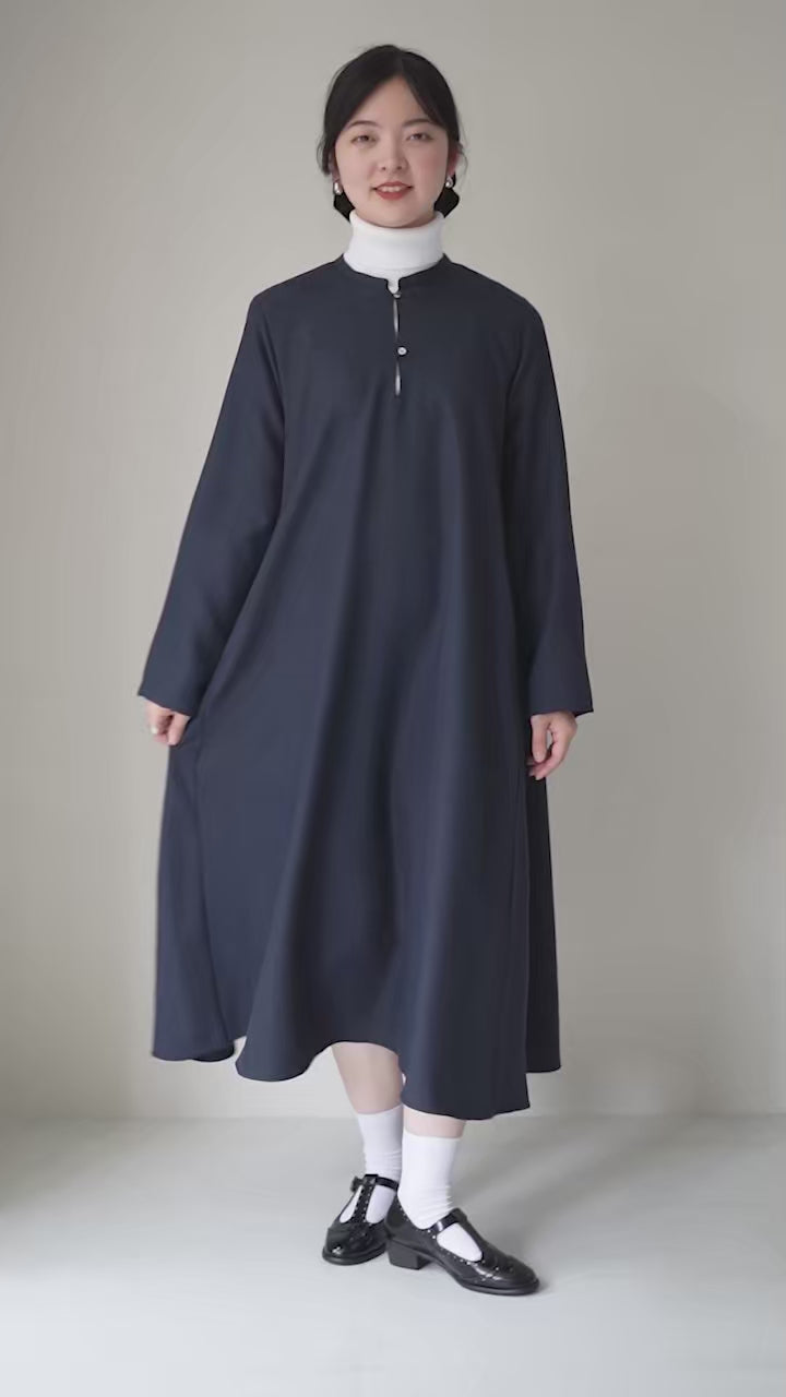 たっぷりを裾幅をもたせたパターンによって、着るだけで360度どこから見ても綺麗なドレープが生まれるデザインに。シンプルさの中にニュアンスのある大人のワンピースコーデが完成します。
