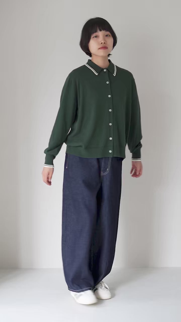 腰上の着丈で、適度なゆとりがありながらすっきりとしたシルエット。首元がしっかり詰まっているため、ボタンを閉じて着ればきちんと感が際立ちますね。