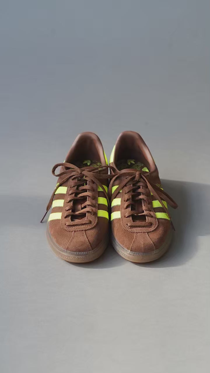 サイドにはadidasの初期プロダクトの雰囲気を漂わせるギザギザの3本ラインを配置。ブラウンにはイエロー、モーブにはミントの差し色がアクセントをプラスします。