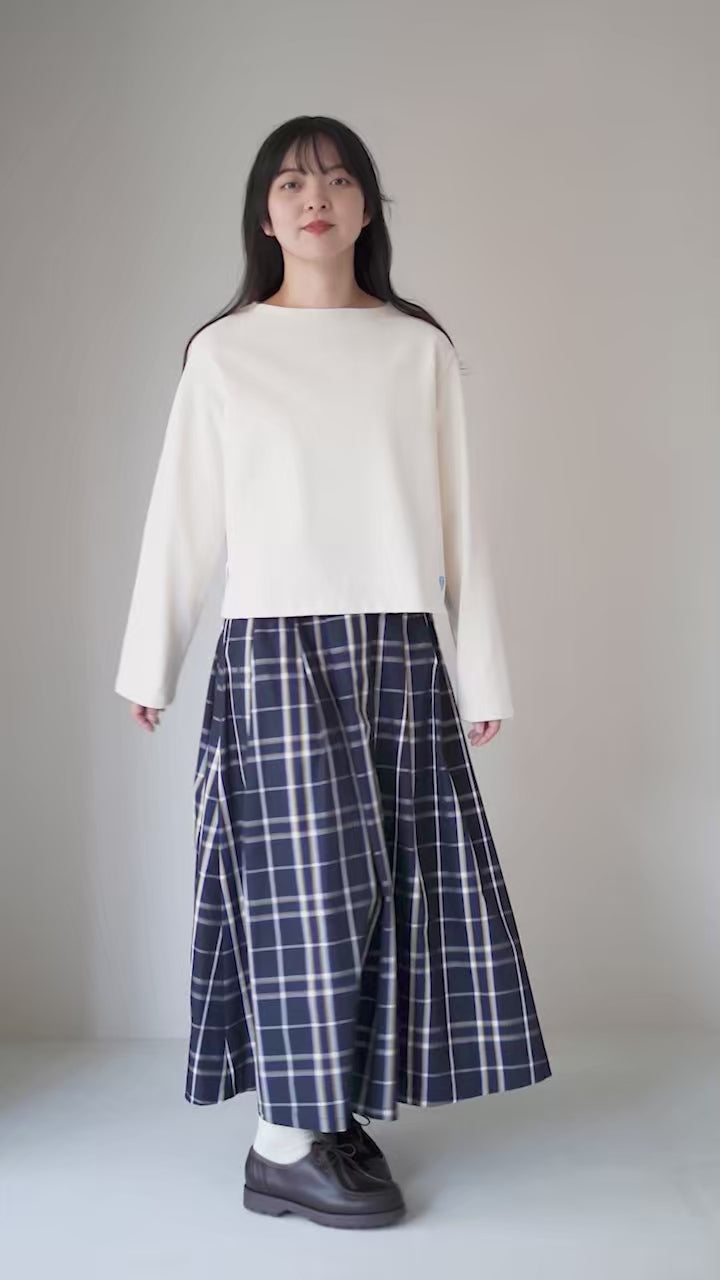 ややゆったりとした身幅に加え、着丈はヒップにかかる程の長さです。袖丈は手の甲がしっかり覆われます。