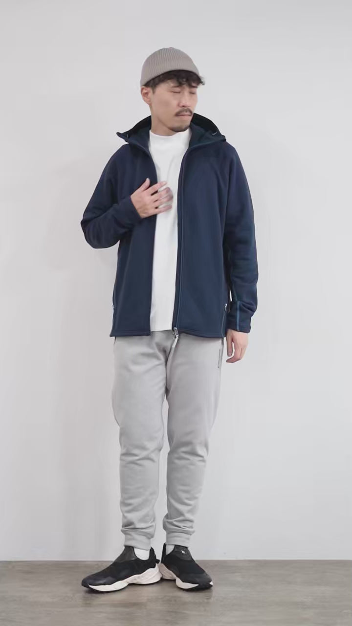 パワーフーディーよりもゆとりを持たせ、普段着用するボトムスとも合わせやすいシルエットに設定。アウトドアシーンのレイヤリングでも邪魔になりづらい「程よい身幅」となっています。