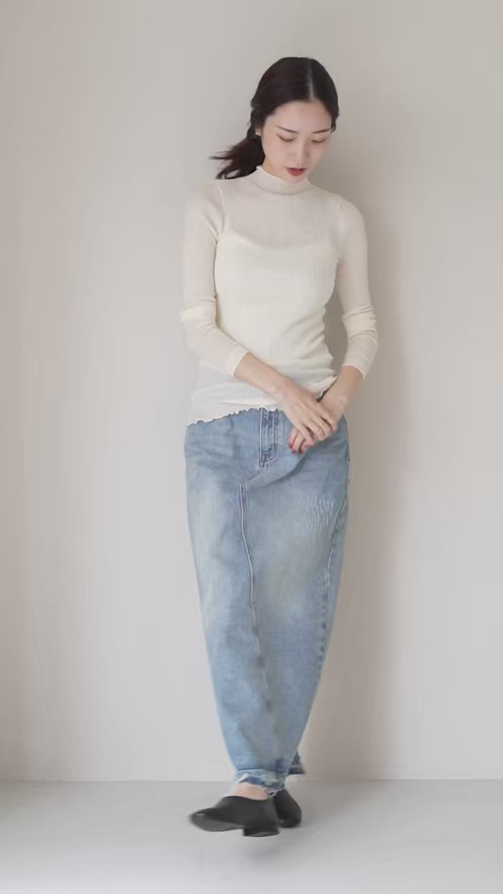 とても身体にフィットするので袖は手首で留まり、着丈はヒップが半分隠れるくらいの長さでした。薄手なのでレイヤードしてもゴワつかないのがいいですね。