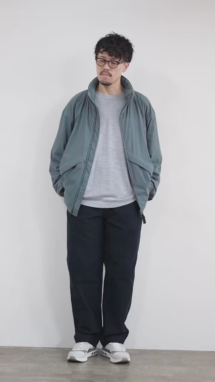 着用モデル写真と同じようなシルエットで着ることが出来ました。ナイロン素材にありがちな光沢が抑えられているため、落ち着いた雰囲気で着こなせるのが好印象です。