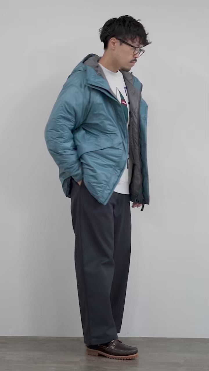 着用モデル写真と同じようなシルエットで着ることが出来ました。ナイロン素材にありがちな光沢が抑えられているため、落ち着いた雰囲気で着こなせるのが好印象です。