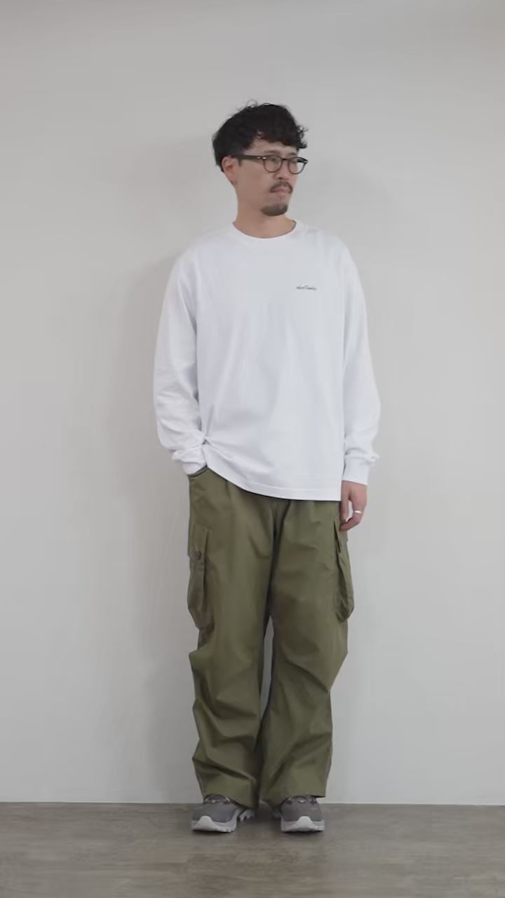 ゆとりのあるサイズ感で、シルエットのバランスが良いです。着丈はヒップが隠れきる程で、袖丈もたまりができるほどです。背面のグラフィックが映えるので1枚でサマになります。