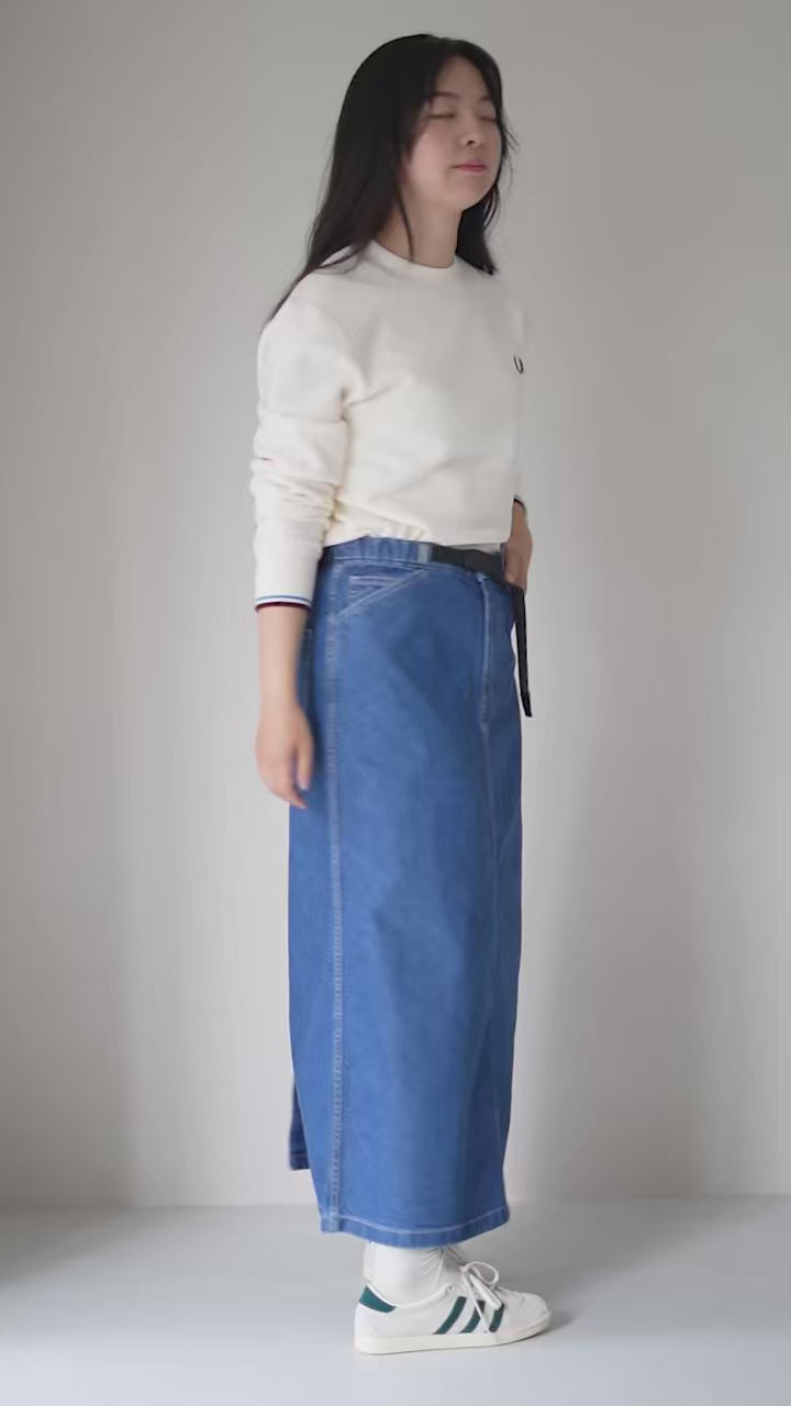 ハリのあるエココットン使用の11オンスデニム生地に、女性らしいAラインと深めのバックスリットを配し、歩きやすさと上品さを両立。ロング丈ながら足さばきは良好で、アクティブに活動する日も頼もしさを感じられます。
