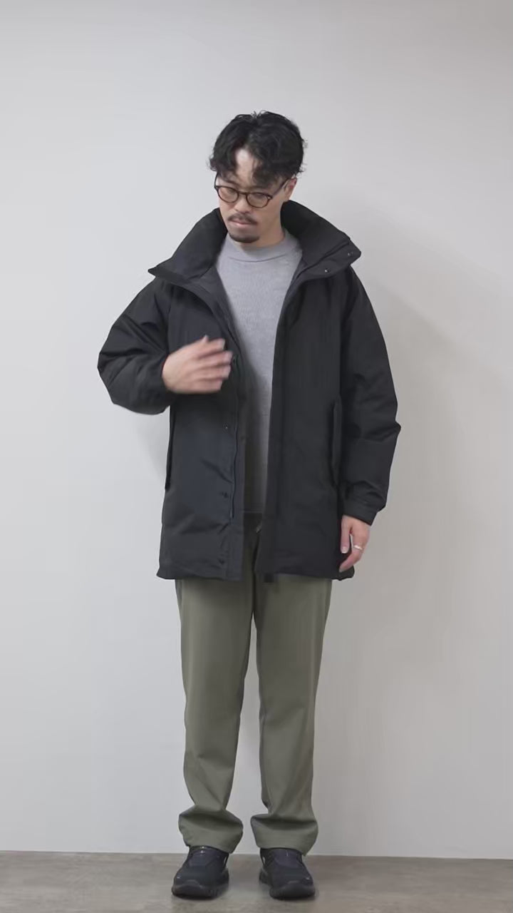 写真のモデルと同じサイズ感で着用できました。肩幅はジャスト、身幅にはゆとりがあるリラックスシルエットで着用できました。スーツの上からでもストレスなく羽織れる余裕があります。袖丈は手首をちょうど覆う長さで、ベルクロでフィット感を調整できるのが便利です。着丈は後身頃でヒップが完全に隠れるロング丈です。