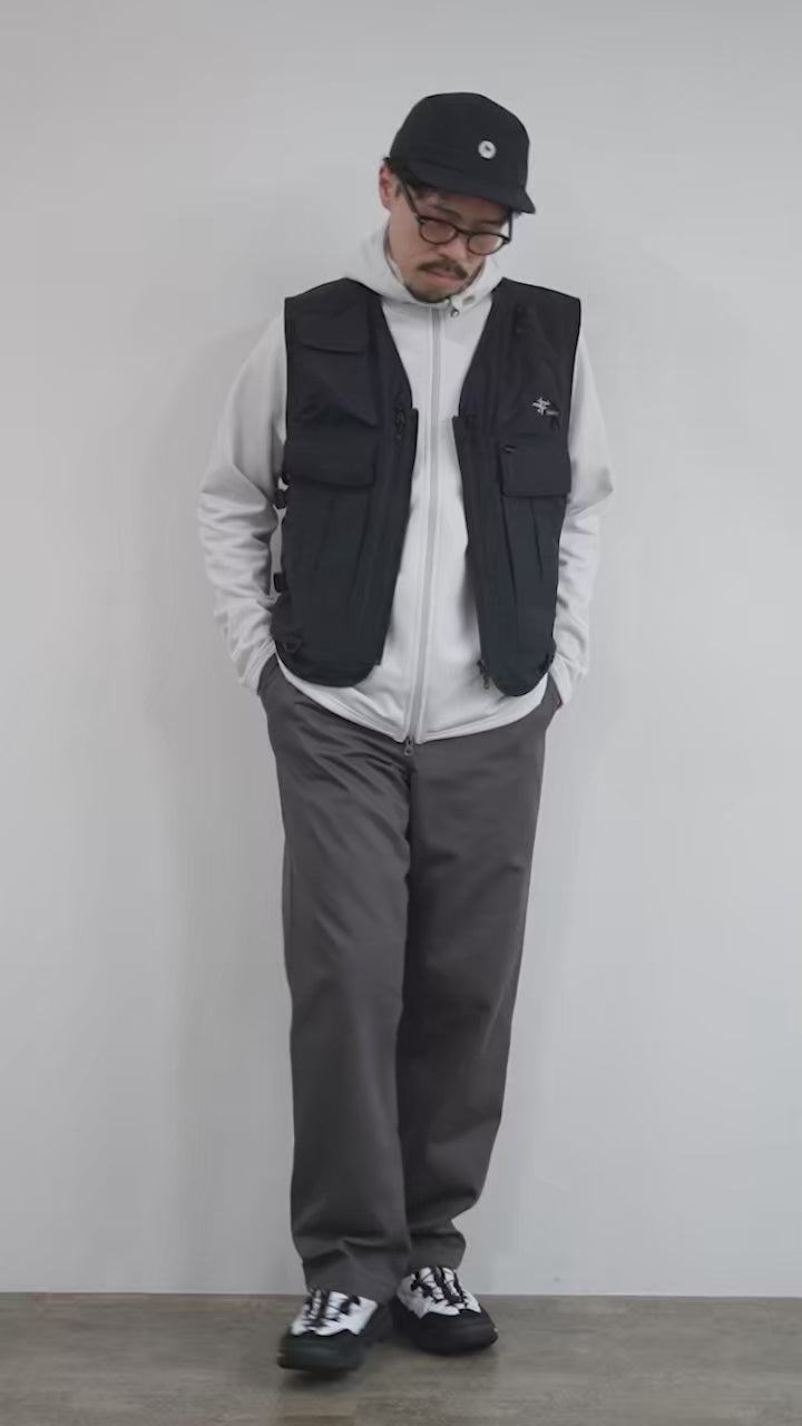 ノーカラーのすっきりとしたデザインは、インナーやアウターとのレイヤードでも重たくならず、快適な着心地をキープ。ストレートなラインと立体的な肩の切り替えで動きやすさを確保。都市の撮影現場から自然のアウトドアまで幅広く活躍する、汎用性の高いシルエットです。