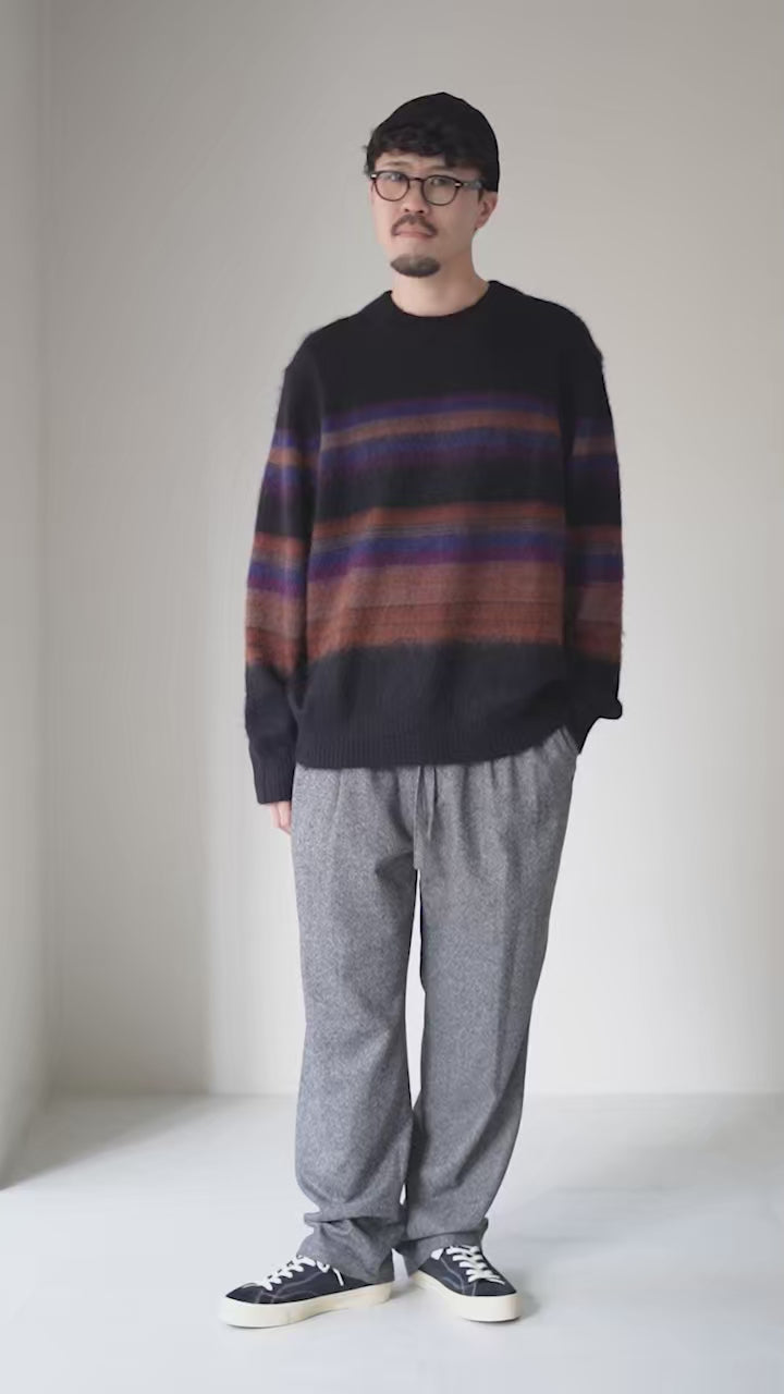 落ち着いたカラーで表現されたボーダー柄が魅力。起毛糸がカラーの境界をぼかし、シャープになりすぎない柔らかな表情を演出。主張が控えめで、柄物が苦手な方でも取り入れやすい仕上がりです。