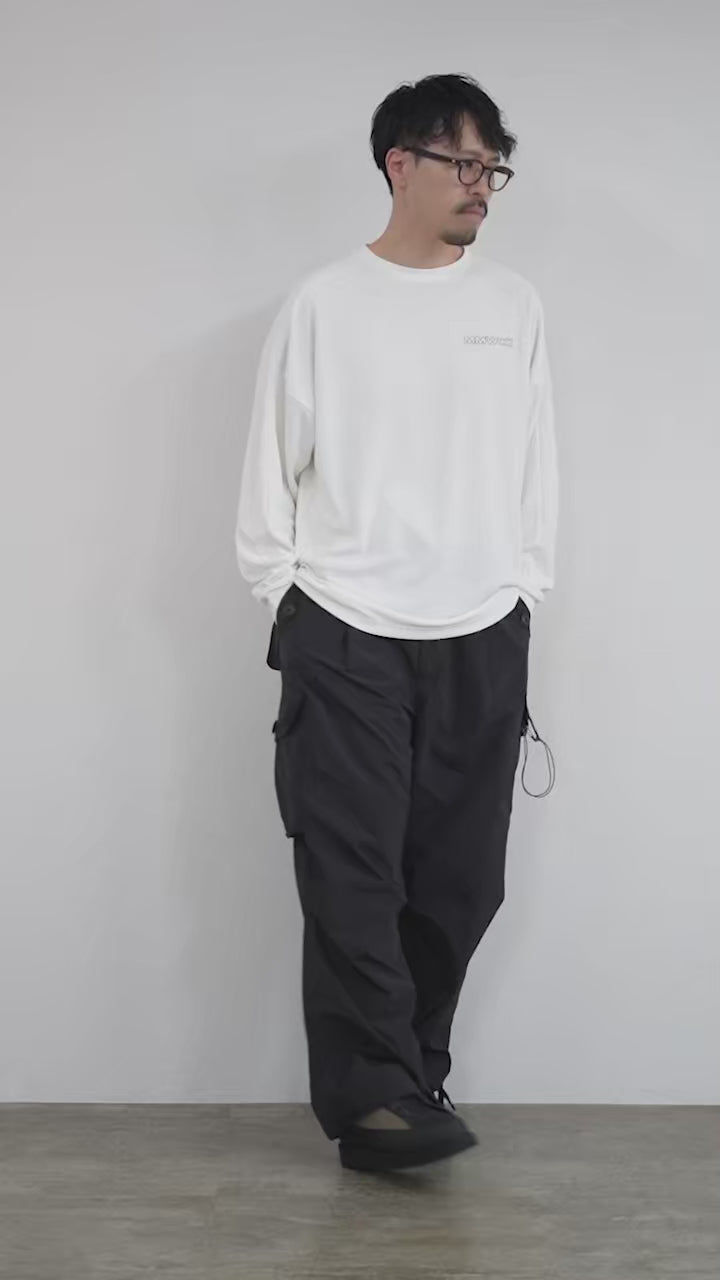 着丈はヒップの3分の2程度が隠れる長さ。袖が長めなので、袖口に溜まる緩い着こなしを楽しめます。速乾性能のある生地で、サラリとした肌触りが心地良かったです。