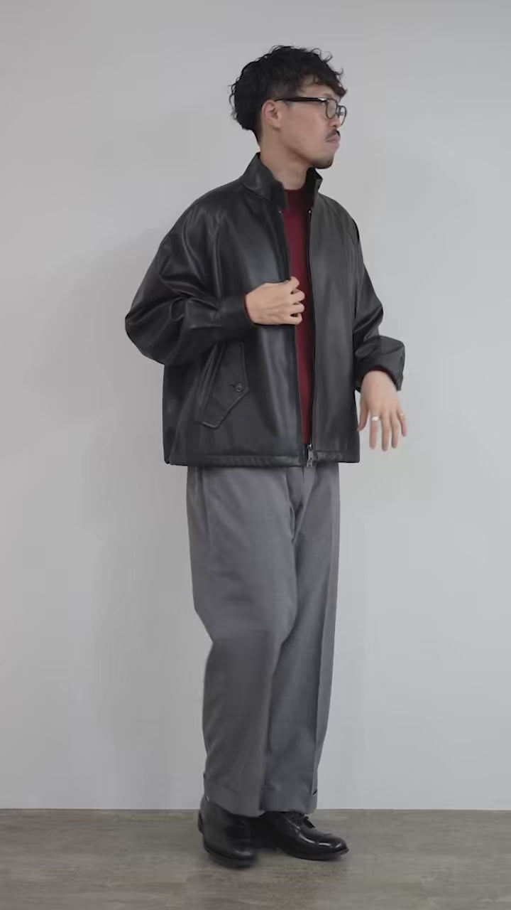 フェイクレザーの柔らかさが加わり、着やすさは抜群。シャツやニット、スラックスとも好相性で幅広いスタイルにマッチします。