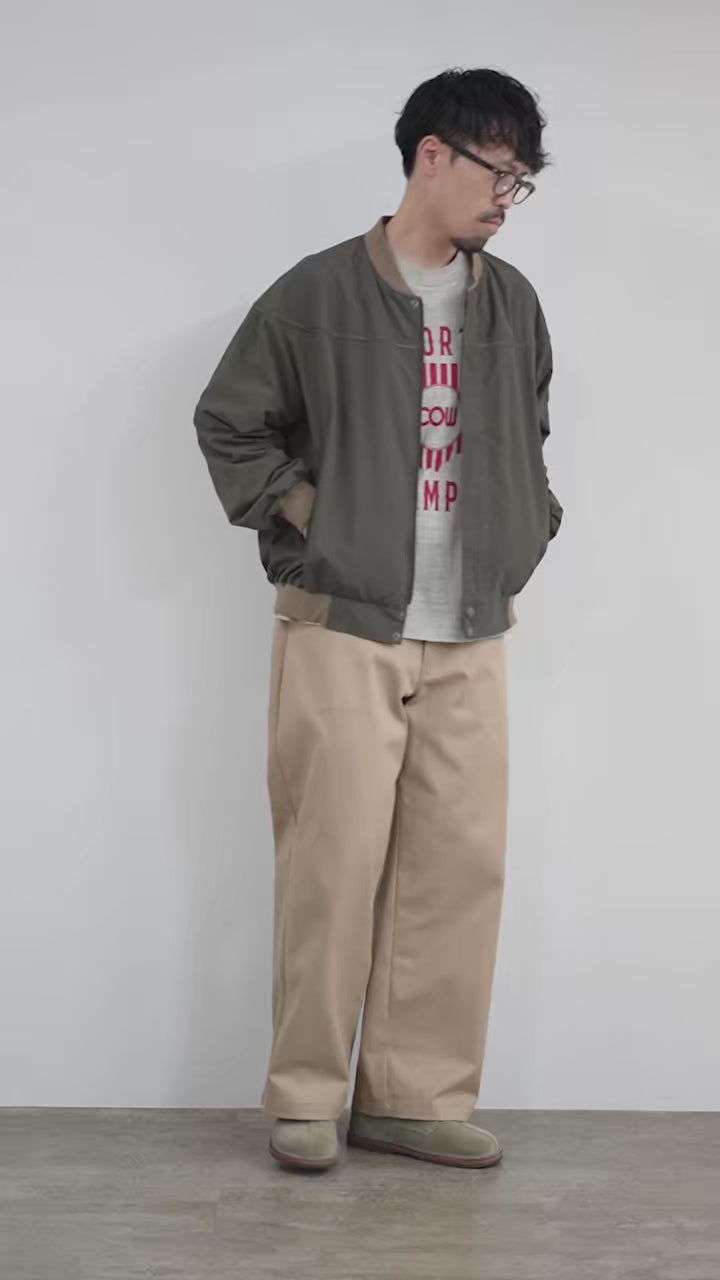 ほどよくゆったりとしたルーズフィットで、厚手のスウェットやフーディーの上からでも窮屈感なく羽織れます。袖丈は手の甲にかかるくらい、着丈はヒップの半分が隠れる長さで、バランス良く着られます。