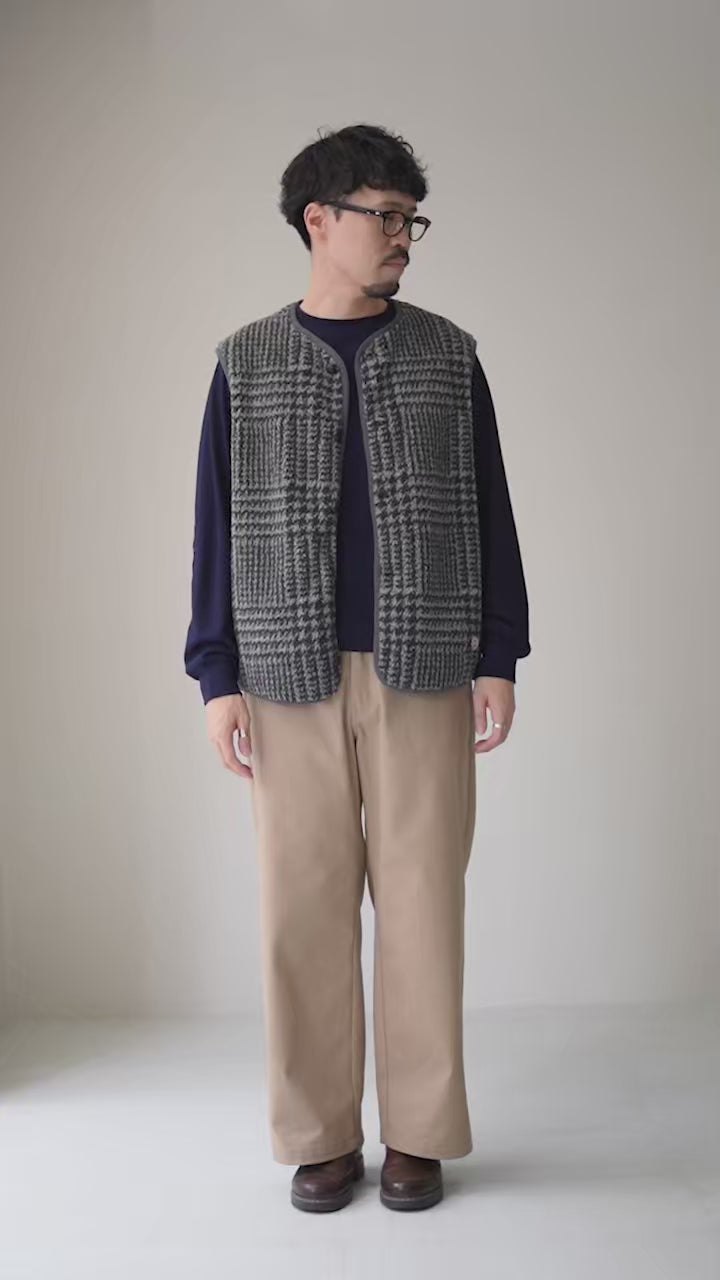 もこもこした素材ながら軽量で、インナーの上からサッと羽織れる使い勝手の良さが魅力。身幅にゆとりを持たせつつ、過度なボリュームを抑えたスマートなシルエットで、メインにもインナーにも使える万能ベストです。