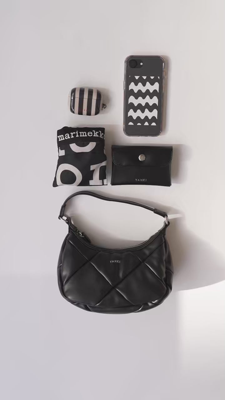 丸みをおびたハーフムーン型のシルエットにキルティングデザインが目を引く、ハンドバッグのご紹介。