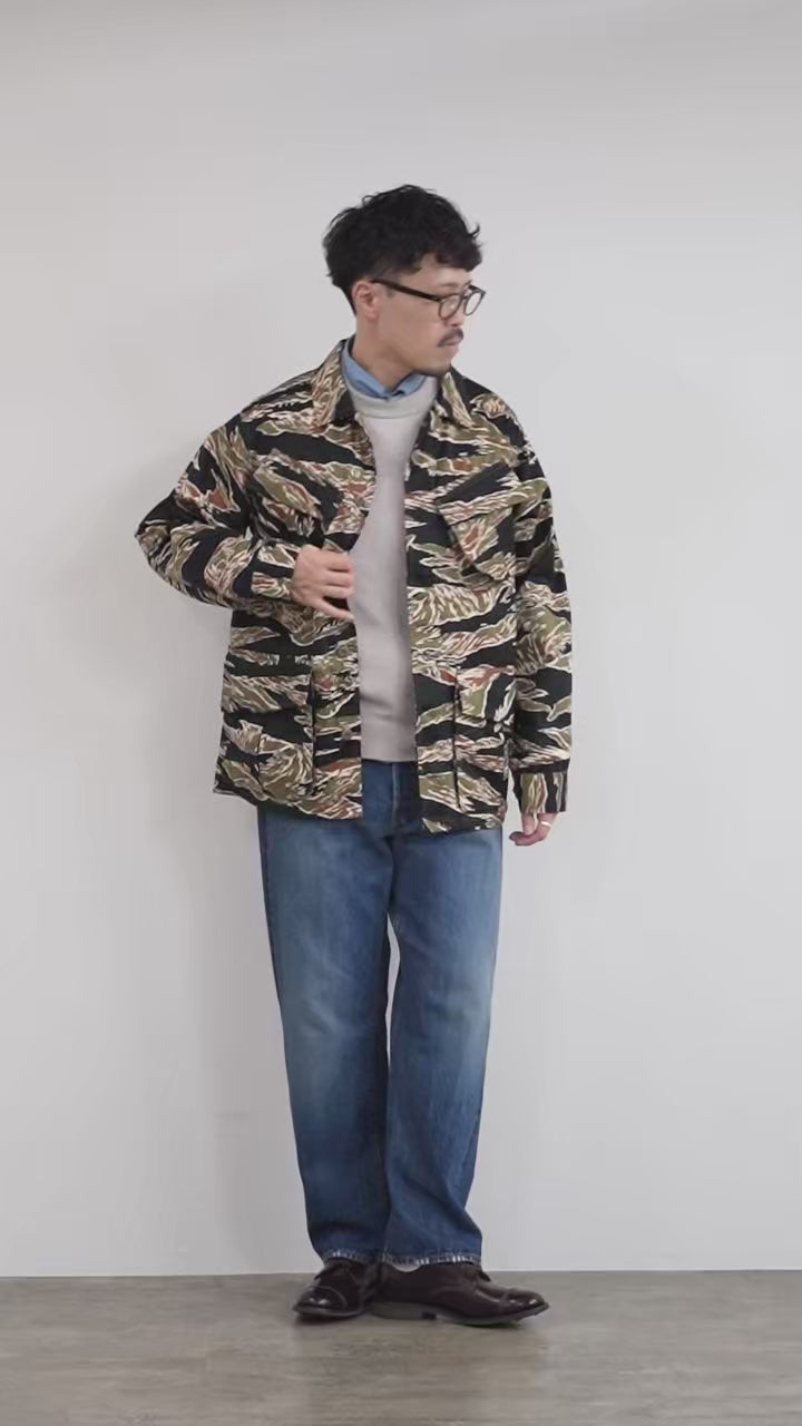 本作は、1970年代のベトナム戦争末期モデルのジャングルファティーグジャケットをベースに、洗練された明るい配色のオリジナルタイガーストライプ迷彩を纏わせた一着。