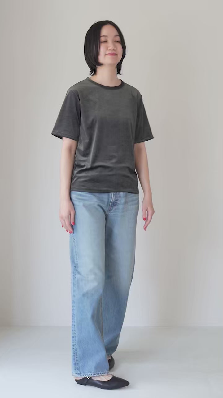 華奢な印象を与えてくれるミニマルなシルエット。ややコンパクトにまとまり、体のラインを自然に見せます。ベロア生地のドレープによって柔らかな落ち感が生まれ、カジュアルさを抑えたTシャツに仕上がっています。