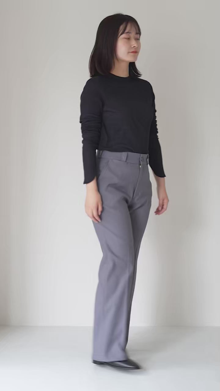 太腿から裾にかけて、太めのストレートシルエット。程よくゆとりのある履き心地ながらも、センタープレスが縦のラインを強調することで脚をすらりと長く見せます。