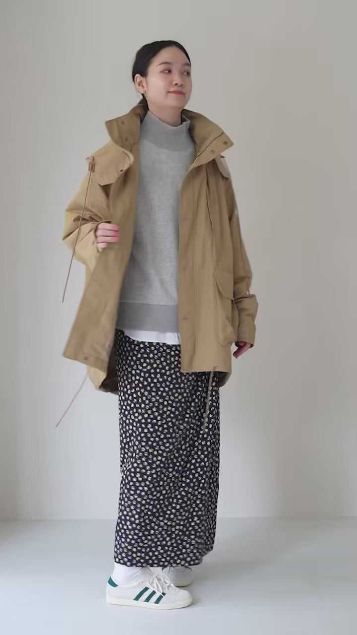 ワークテイスト漂うディテールが魅力で、取り外し可能なフードや立体的なパッチポケット、袖口のベルクロなど実用性とデザイン性を両立。また、前後差のある裾は動きやすさだけでなく体型カバーにも効果的です。