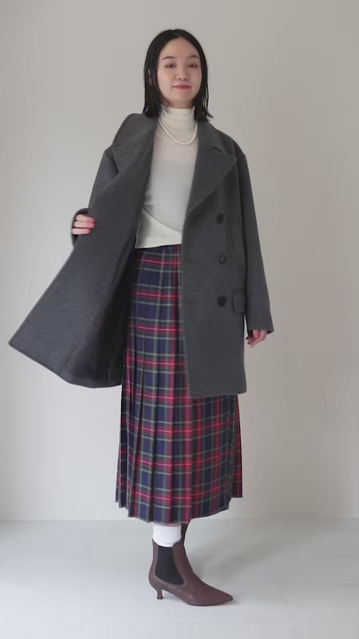 動くたびに生地の艶が際立ち、クラシックなPコートを現代的にアップデートしたような一着です。
