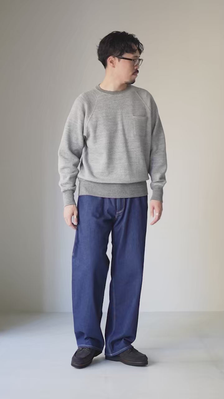 身幅は程よく余裕があり、着丈はヒップ3分の1が隠れる長さです。着丈が少し短めなので、野暮ったさなくヴィンテージスウェットのように着ることができます。