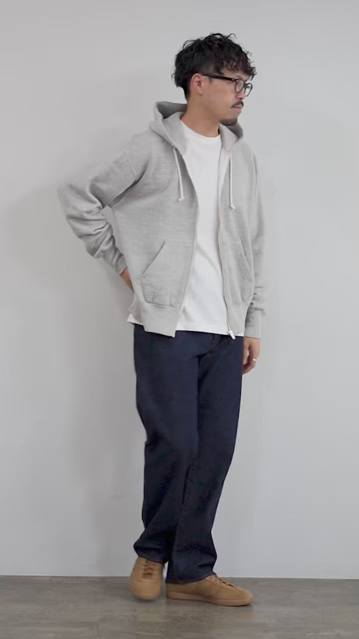 繊細さと古着感を両立したスウェットを目指し、原料と番手使いに工夫を加えて開発した特別な起毛素材。紡績の工程で生まれてしまう落ち綿もふんだんに活用したエシカルな側面も持ち合わせています。