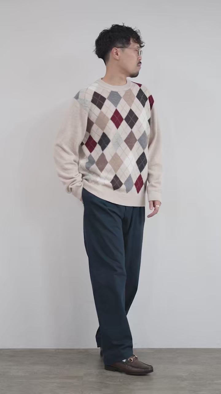計10色を使用した贅沢なアーガイル柄。色が増えることで糸の切り替え作業も増え、機械だけでは作れない“半ハンドメイド”仕様で仕上げられています。いつものスタイリングに華を添えてくれる、温かみのあるデザインです。