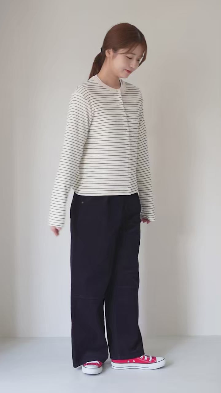 首元は幅広いスタイルに合わせやすいクルーネック。きらっと輝くリングドットのスナップボタンがワンポイントです。