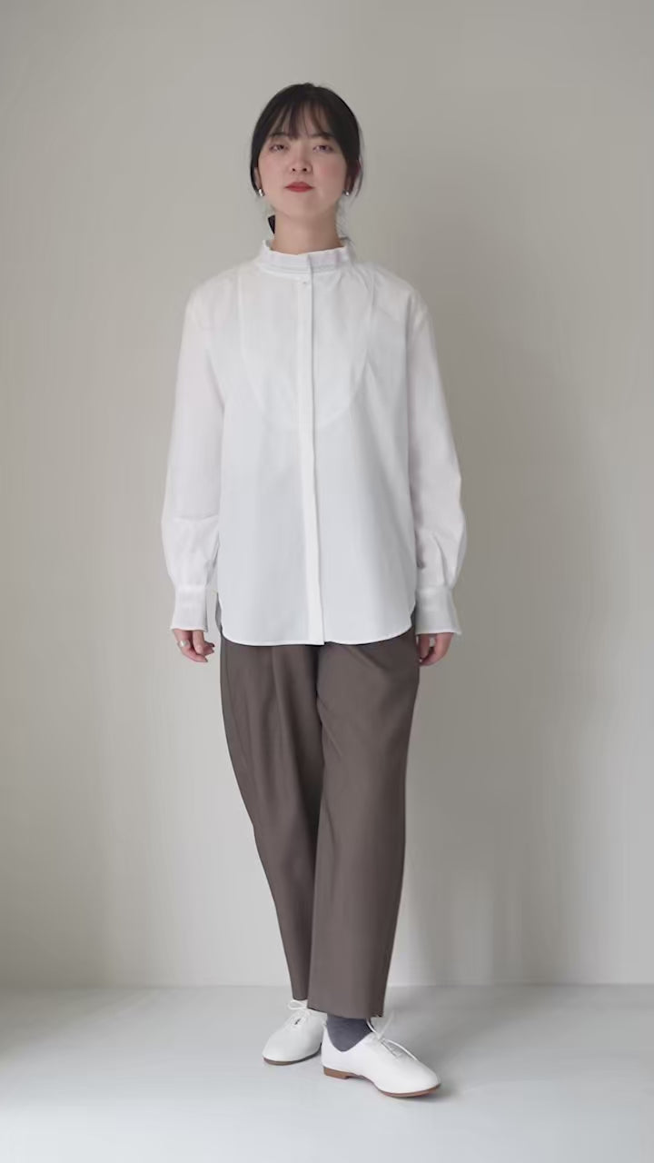 襟元と袖口にあしらわれた繊細なプリーツが、シンプルな装いに華を添える一枚。