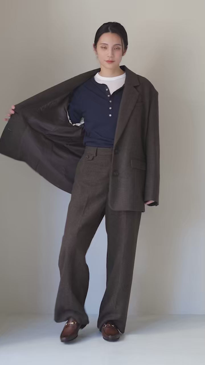 暖かみのあるツイード素材で季節感が漂う一着。ヴィンテージライクな素材感に加え、直角肩のシルエットや低めに設定した2連のボタンがマニッシュコーデのかっちり感を引き立てます。