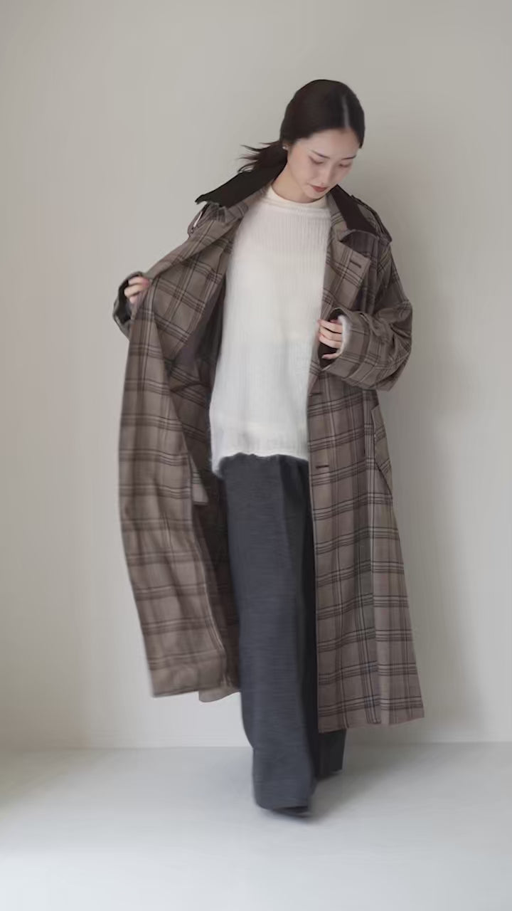 ゆったりとした肩幅と身幅の設計で、厚手のニットやジャケットの上からでも窮屈さを感じにくい着心地。裾に向かって自然に広がるフォルムが、身長を問わずバランスよく映え、縦ラインを意識したすっきりとした印象です。