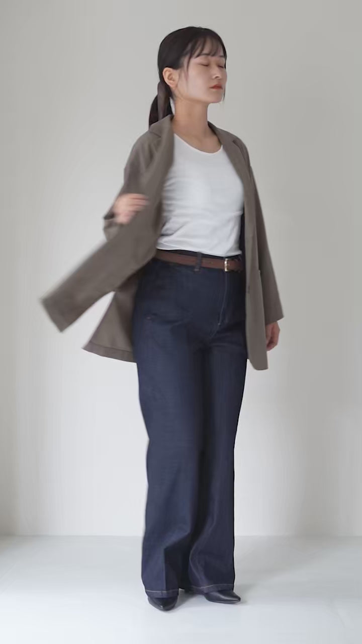 袖は手の甲の半分ぐらいの長さで、着丈もヒップをしっかり覆い、太ももの半分ほどの丈感でした。かっちり感のあるアイテムですが、デニムパンツやカジュアルなスカートとも合わせられそうな丁度いいバランスが嬉しいですね。