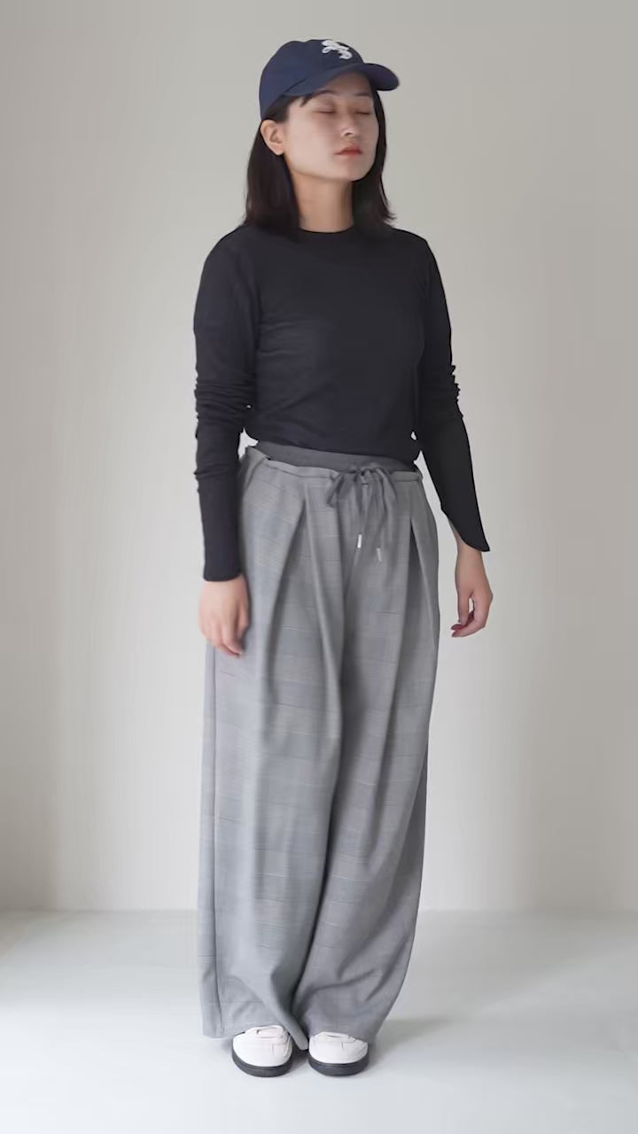 落ち着いた印象を与えてくれるグレンチェックのワイドパンツ。そこに光沢感のあるウエストラインをドッキングし、きちんと感とカジュアルテイストの絶妙なバランスを保ったスタイルが誕生。