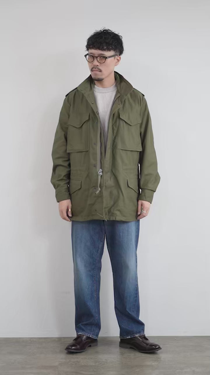 程よいゆとりのあるサイズ感です。身幅が広いため、厚手のスウェットやシャツの上からも快適に羽織れます。着丈はヒップをしっかりと覆う長さで、M-65らしい武骨な雰囲気を残しつつ、街着として着映えします。