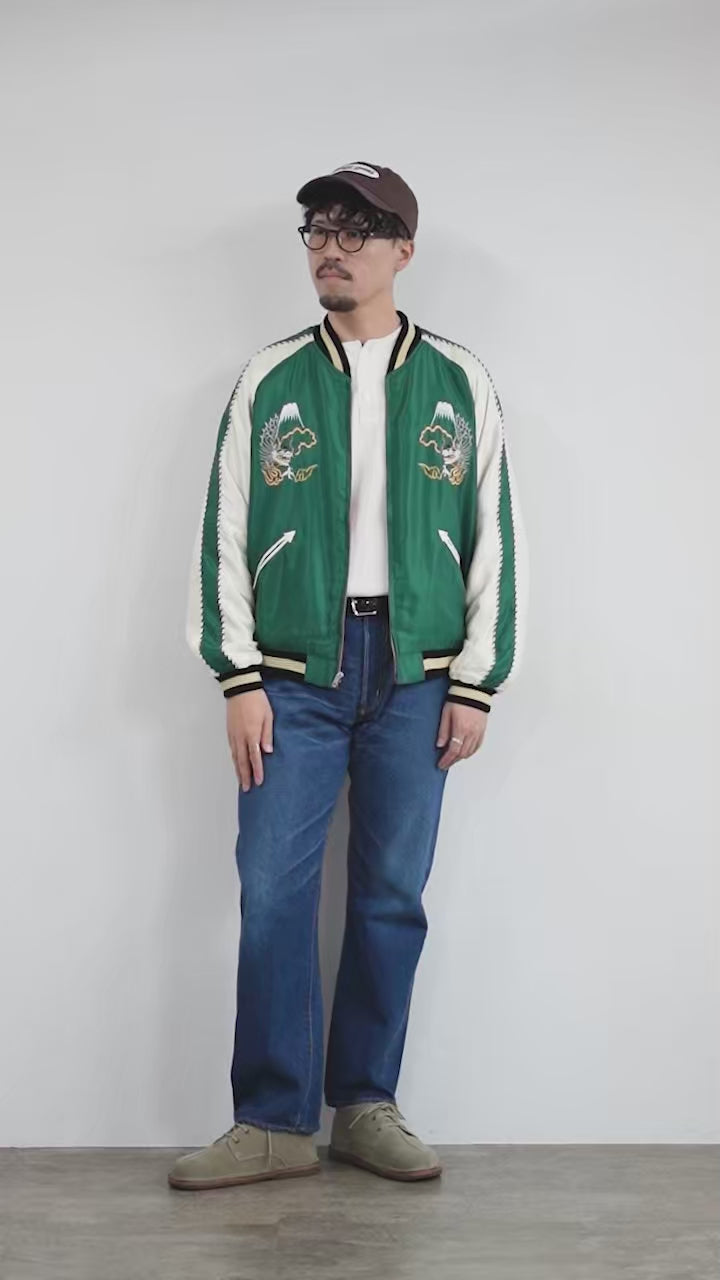 戦後スカジャンの王道、高級感あるシルクのような独特の光沢感と柔らかく流れるような落ち感を両立した、袖や身頃が描く美しいドレープが特徴です。