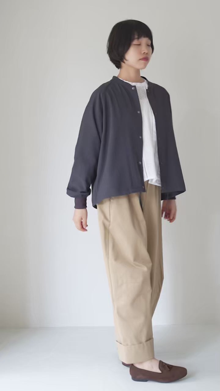 首元はすっきりとしたノーカラー。フロントのスナップボタンはボディと同色であしらい、無駄のない洗練された印象に仕上がっています。