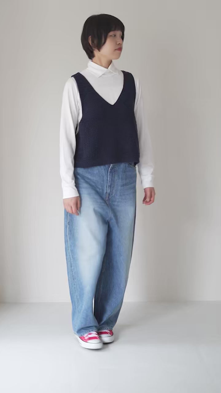 首周りをスッキリ見せるVネックデザイン。合わせるトップスによってガラリと変わる表情の違いをお楽しみいただけます。